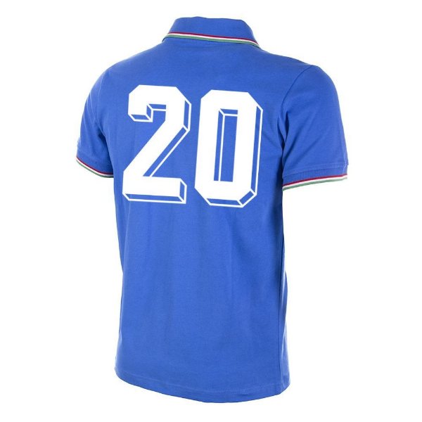 Avec son capitaine Dino Zoff et Paolo Rossi meilleur buteur de la compétition, la Squadra Azzurra a remporté sa troisième Coupe du monde de football en Espagne lors de l'été 1982 en battant l'Allemagne de l'Ouest en finale 3 buts à 1 devant 90000 spectateurs au stade Santiago Bernabéu. Ce maillot vintage est une réplique par Copa Football du maillot de l'équipe d'Italie composée entre autres de Marco Tardelli, Giuseppe Bergomi, Claudio Gentile et Bruno Conti, dont l'équipementier était à l'époque Le Coq Sportif.