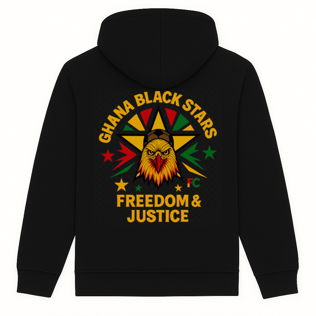 Sweat à capuche de football du Ghana signé FC ELEVEN pour adultes. Le hoodie épais est fabriqué en coton biologique lourd. L’élément distinctif de ce sweat à capuche est l’imprimé graphique coloré représentant les Ghana Black Stars au dos. L’impression affiche les mots « Ghana Black Stars » et « Freedom & Justice », avec une étoile et un aigle au centre. Le logo de la marque FC ELEVEN est brodé sur la poitrine gauche. Le sweat épais est entièrement noir, doté d’une capuche à cordons et d’une grande poche ventrale. Il présente une coupe régulière. Matière : 65 % coton et 35 % polyester.