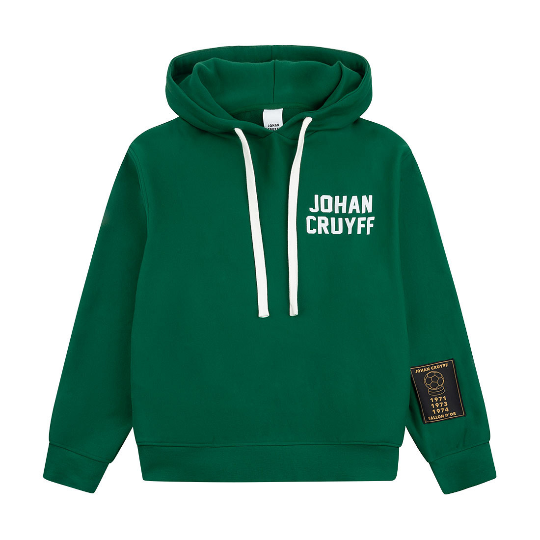 Sweat à capuche Johan Cruyff élégant en vert pour adultes. Ce sweat premium est confectionné en 100% coton French terry épais et offre une coupe décontractée pour un confort optimal. Un logo Johan Cruyff blanc est apposé sur la poitrine. Le patch Ballon d'Or sur la manche gauche indique les années durant lesquelles Johan Cruyff a remporté ce prestigieux trophée. Le col et l’ourlet côtelés apportent une finition raffinée et luxueuse. Un parfait équilibre entre confort, style et héritage footballistique.