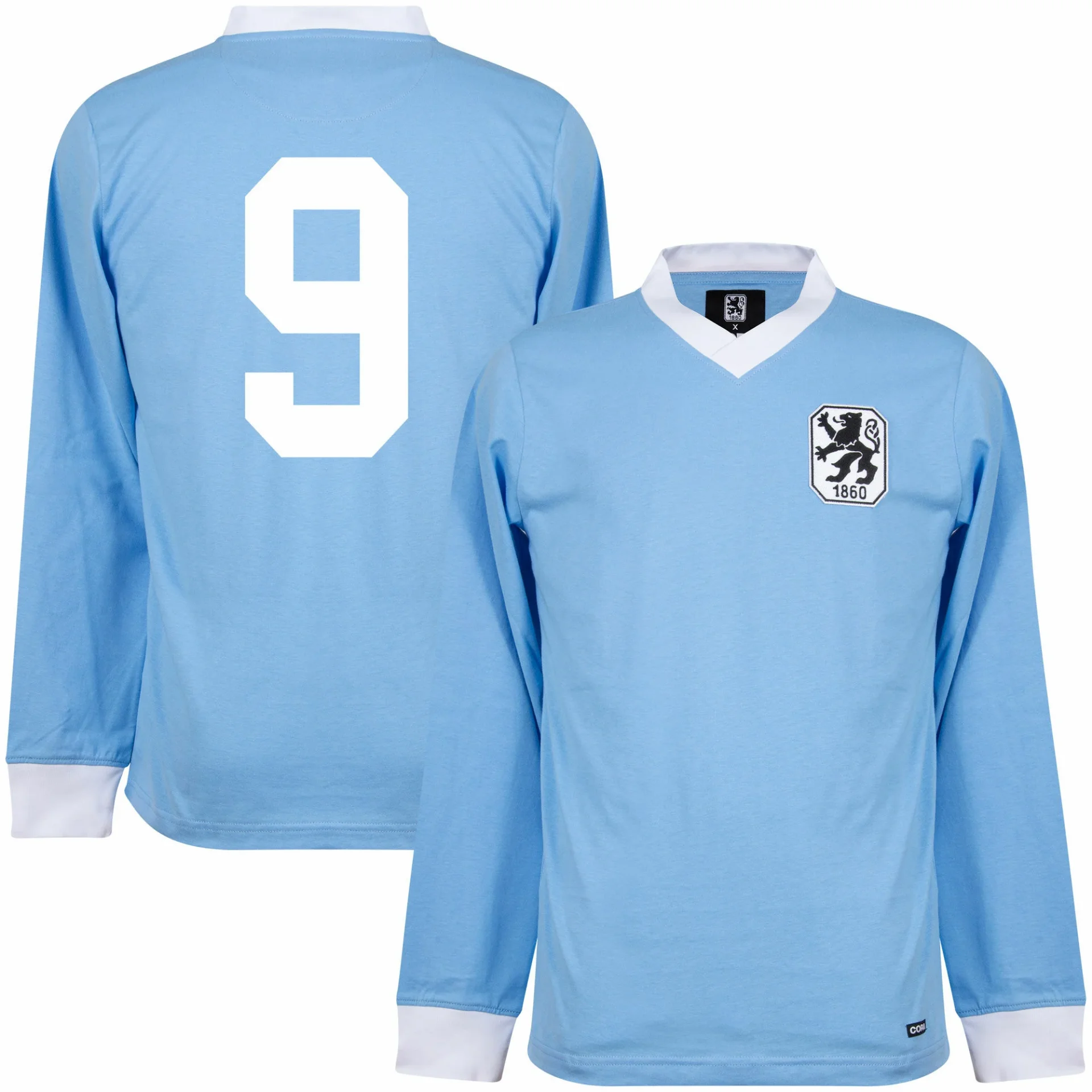Voici le maillot de football rétro officiel du TSV 1860 Munich (saison 1965-1966) pour adultes, de la marque COPA Football. Le numéro 9 est floqué au dos. Ce maillot à manches longues est inspiré du maillot domicile des « Lions » de la saison 1965-1966. Il est principalement bleu clair avec des détails blancs. Le liseré et le col en V sont blancs. Le logo du TSV 1860 Munich est apposé sur la poitrine gauche. Un incontournable pour tout supporter du TSV 1860 Munich ! Composition : 100 % coton.