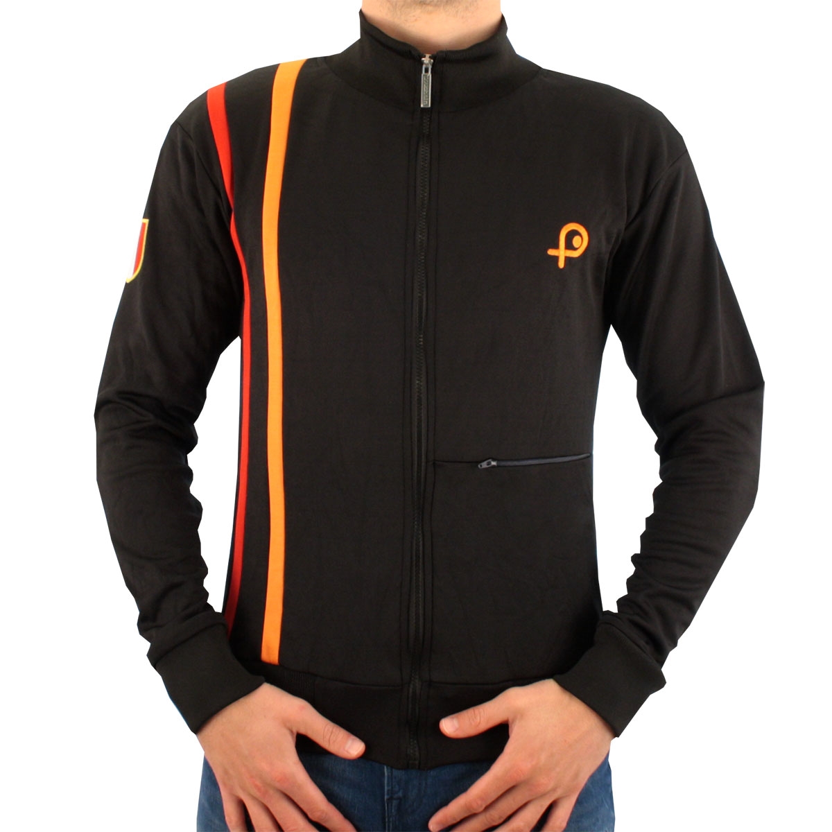 Veste de survêtement Alessandro '79 de Pouchain dans un style rétro avec 2 bandes verticales orange et jaune sur le côté droit qui lui donne un aspect sport vintage années 70 et un écusson aux couleurs de l'Italie cousu sur la manche droite pour rappeler les origines du label mythique Pouchain Sportswear.